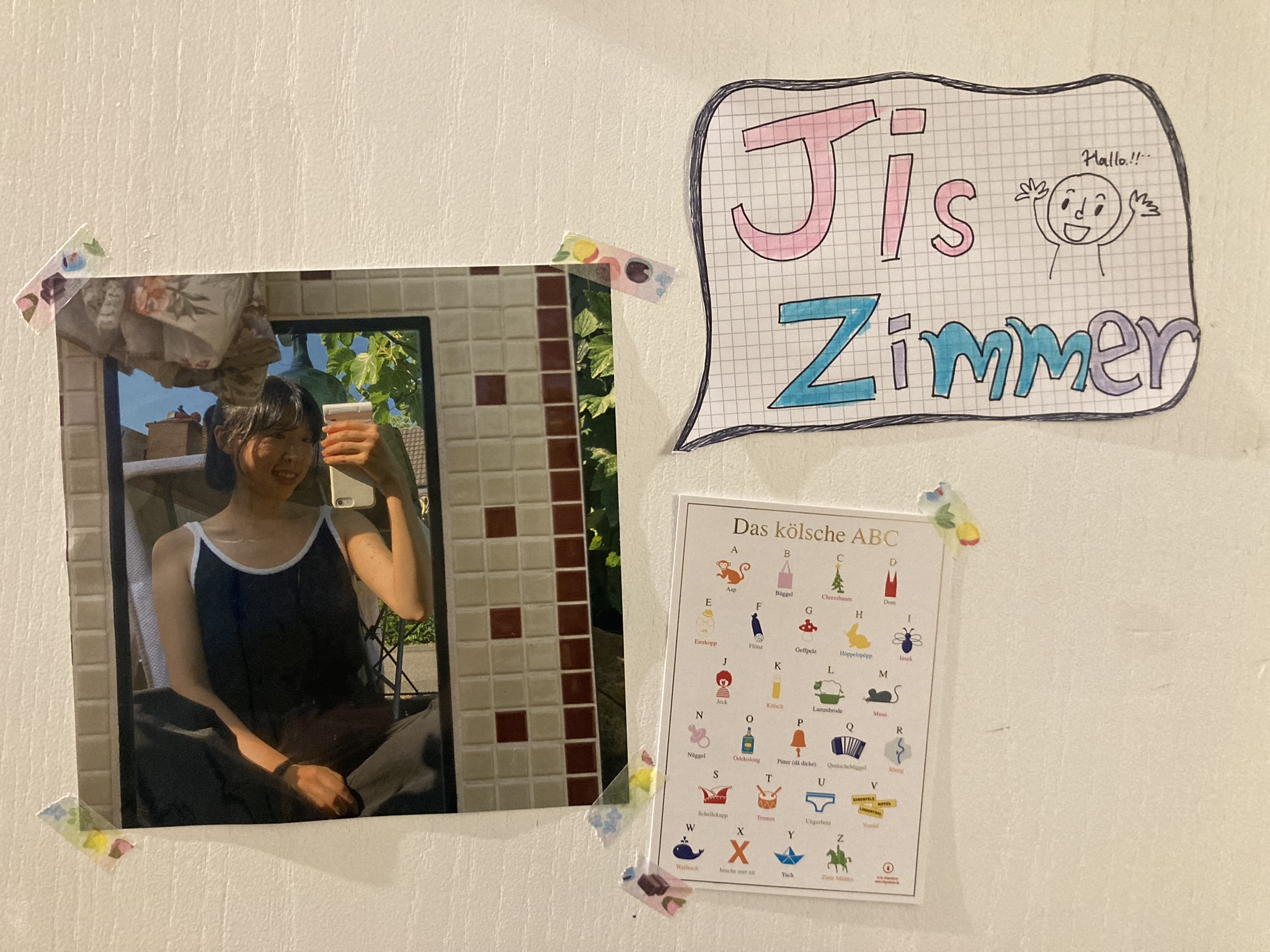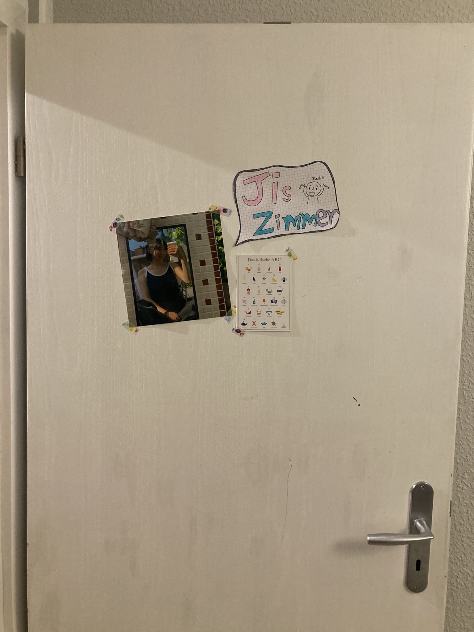 방 문을 꾸몄다는것부터 시작해야겠다 흐흐흐. 6일 금요일엔 뒤셀도르프에 다녀왔었다. (조만간 이 내용도 올릴 예정이다.) 그 날 아침에 버스를 기다리며 Rossmann(우리나라의 올리브영!)을 구경하던 중 사진인화하는 기계가 있길래 내 사진으로 인화를 시도해봤었다. 그런데 사이즈 선택이 20*20 또는 20*30뿐이어서 그나마 작은것인 20*20사이즈를 골랐는데, 세상에나.. 20cm는 생각보다 큰 사이즈였다. 여행 시작부터 짐이 추가되어 조금 당황했지만 이 사진을 어떻게 쓸까 고민하던 중, 방 문에 붙여야겠다싶어 이렇게 해놓은것이다 흐흐~~