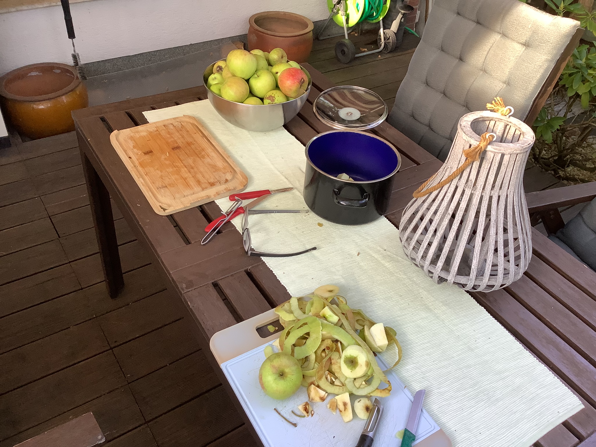 여차저차 하다보니 오후시간이 다 지나갔고, 저녁 6시쯤? 되어 본격적인 사과무스 만들기를 시작했다. 어제 아저씨가 뒷마당의 사과나무에서 사과를 엄청 많이 따왔는데, 덜 익었으며 상처가 났거나 벌레먹은것들 위주였다. 근데 큰 바구니로 한가득이어서, 왠지 다 벌레먹은건가... 싶었다 ㅎ...