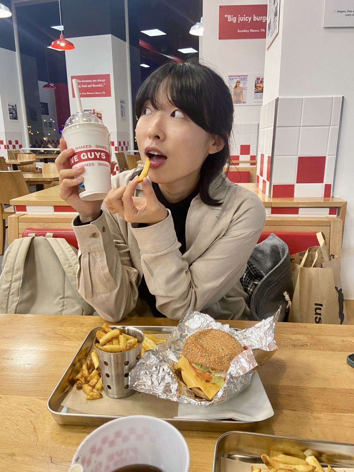그리고 이 날 목요일 저녁엔, 아야카와 함께 '파이브 가이즈' 라는 패스트푸드점에서 저녁을 먹었다. 밀크쉐이크가 맛있다고만 들어본 패스트 푸드점이었고, 그 외엔 그냥 '유명하다더라~~' 하는 이야기만 들었기에 뭐 어떤 햄버거를 파는진 잘 몰랐었다. 가격은 저렴하진 않았으나, 서브웨이처럼 재료를 직접 고를 수 있는 시스템이었기에 특정 재료를 먹지 않는 사람들에겐 좋을것 같았다.(아야카는 마요네즈를 먹지 않기에, 이 곳처럼 직접 재료를 고르는게 좋다고 했기 때문! 사실 아야카의 말을 듣고난 뒤에야 떠오른 생각이었당!) 햄버거와 함께 시킨 감자튀김과 밀크쉐이크는 양이 너무 많아서 결국 버..렸...고..ㅎ...지금 생각하니 아깝네... 가져올껄....ㅠ_ㅠ.... 파이브 가이즈를 처음 와 본 나를 위해 아야카가 찍어준 사진을 올린다 히히!