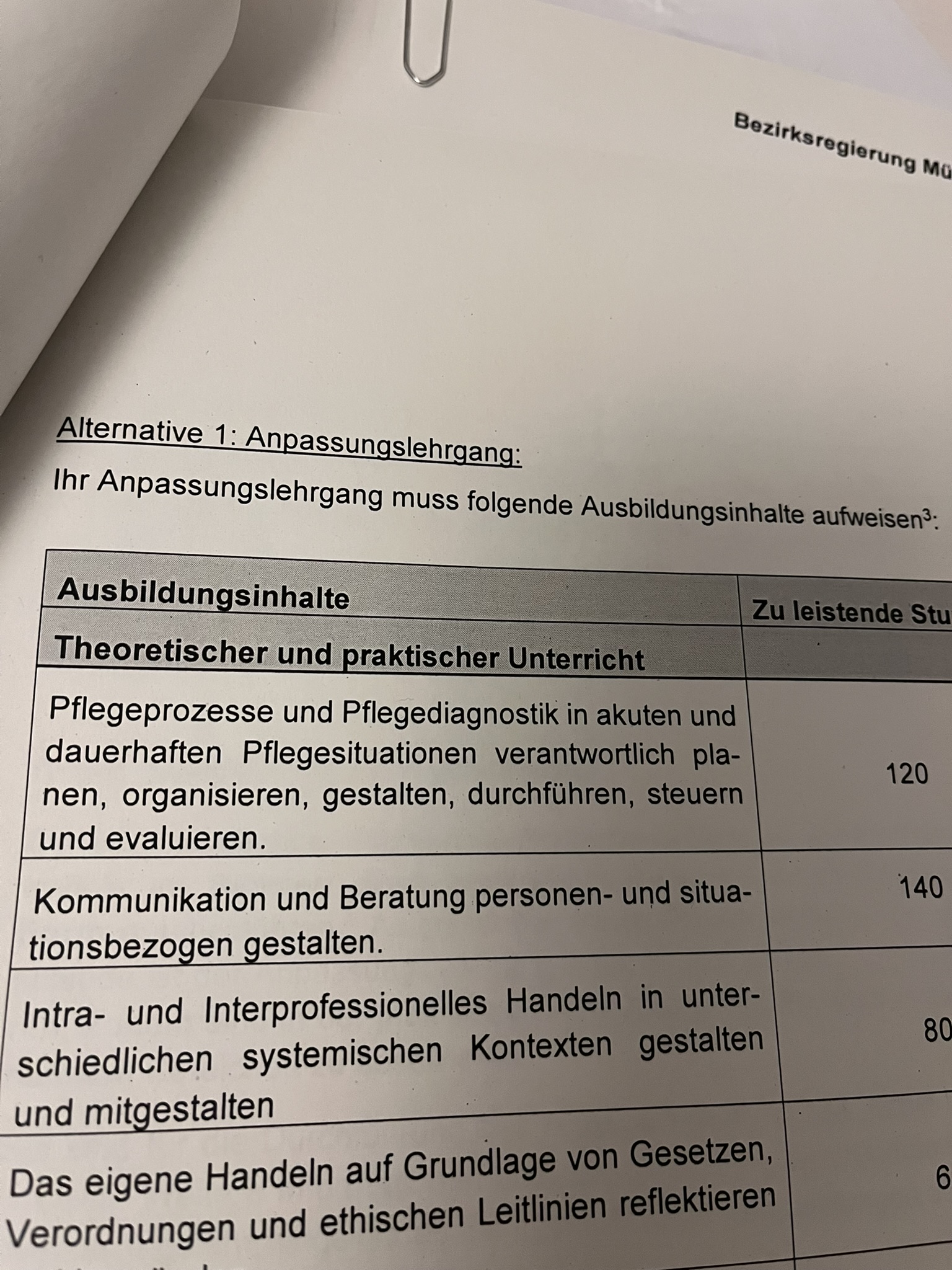 앞으로 이수해야 될 이론 및 실습 수업과, 병원에서 진행해야 될 임상실습의 종류가 적혀있고 그 옆엔 이수 시간이 적혀있다. 적응 교육을 선택하는 나로서는, 앞으로 560시간의 이론 및 실습수업과 400시간의 임상실습을 마쳐야 되는 것이다. 그리고 이로써 본격적인 독일 생활을 시작하게 되었으니, 생활비를 벌어야 한다. 따라서 나의 계획은, 실습하게 될 병원에서 우선 간호조무사로서 일하며 돈을 벌고 동시에 실습과 수업을 진행하는 것이다!!!! 병원에서 이리저리 굴려지다보면 독일어도 자연스럽게 늘겠지 흐헝헝헝 좋네 ㅠ_ㅠ!!!!!