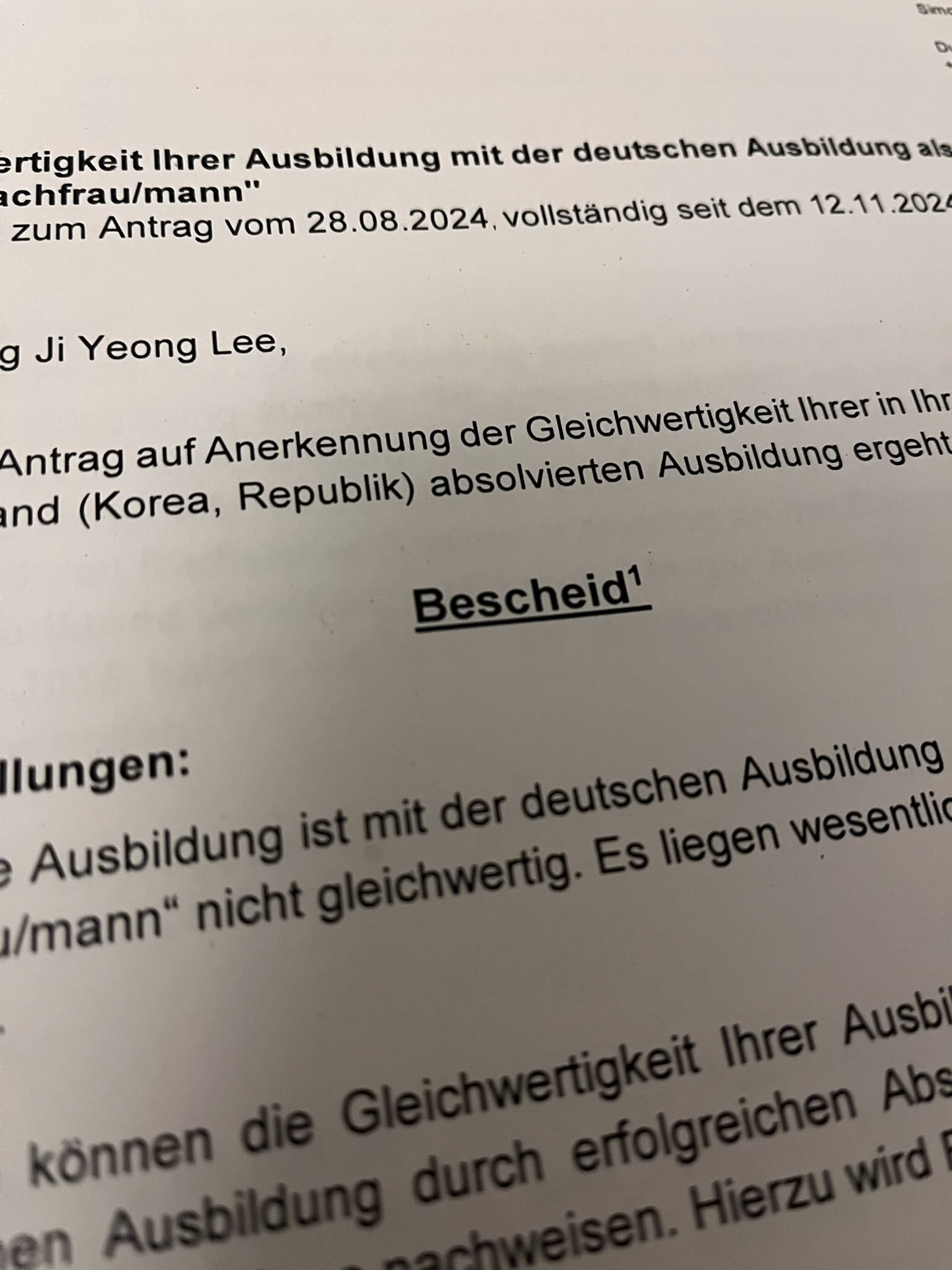 다시 정리해보자면, 나는 독일에서 간호사로 일하기 위해 한국에서 서류들을 챙겨 독일로 왔다. 그 서류엔 면허증부터 시작해 고등학교 졸업증명서, 대학교 졸업증명서와 시간이수가 기재된 성적표, 실습 확인서, 경력 증명서 등이 속한다. 이는 한국 간호사와 독일 간호사에 대한 일종의 '자격 동등성'을 비교하는 과정에 필요하며, 이를 'Anerkennung' 즉, '인증'으로 칭한다. 그리고 나는 그 Anerkennung 과정에 진입하기위해 서류를 제출해 지금까지 기다려왔던 것이고, 이제 이에 대한 Besched, 즉 '결정'이 난 것이다. 앞으로 내가 어떤식으로 인증과정을 진행할 수 있는지에 대한게 결정된 것이다.