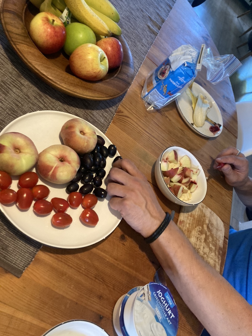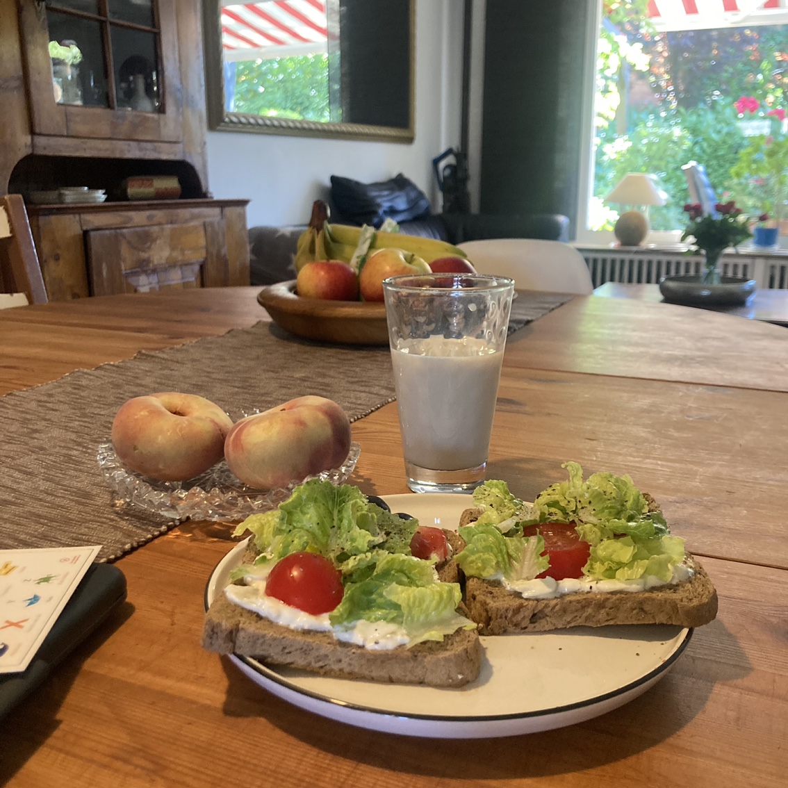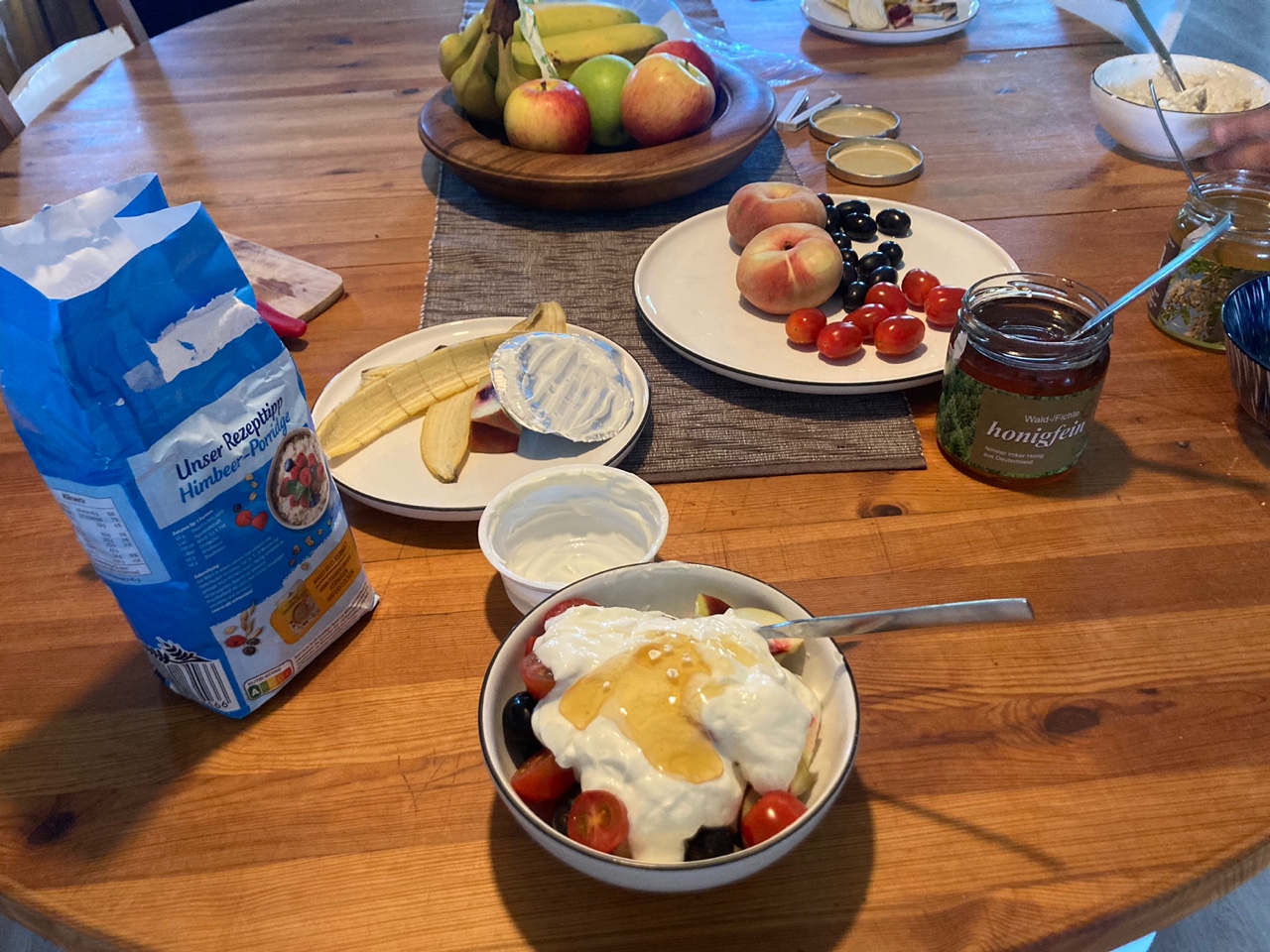 전날인 14일 아침엔 전형적인 독일 아침식사(여러가지 치즈, 소세지, 빵, 잼, 야채등을 상에 쭉 펴놓고 각자의 접시에 샌드위치처럼 만들어서 먹으며, 옆엔 다양한 주스와 물을 꺼내놓고 마시고싶은대로 마신다.) 를 했었기에 오늘은 간단하게 먹자며 로버트가 준비한것은 요거트. 잘게 갈린 귀리와 각종 과일들, 아카시아 꿀과 숲 꿀(표지에 그냥 진짜 숲 꿀이라고 적혀있었음ㅎ.. 로버트가 말하길, 숲 꿀은 아카시아꿀보다 덜 달고 조금 쓴 맛이 느껴진다고 했다. 그치만 자기는 숲 꿀이 더 좋다길래 나도 숲 꿀을 선택함 히히) 그리고 작은 도마와 작은 칼, 오목한 접시 두개를 꺼내어 식탁에 차렸다. (간단하게라고 했지만 이것 또한 엄청난걸요...?!) 사실 생각해보면 이런것들이 그저 이 나라의 식습관일 뿐이겠지만, 동양에서 온 나는 특히 50살의 중년남성이 이렇게 정성껏 요거트를 만들어 먹는다는것이 참으로 놀라웠다. 열심히 과일을 썰고있는 로버트에게 내 소감(?)을 말해야겠다싶어 머릿속으로 열심히 문장을 구성한 후 용기를 내서 말했다. "한국의 나이든 어른들은 이러한 요거트를 식사로 잘 먹진 않아요. 주로 젊은사람들이 먹거든요. 그치만 당신은 이렇게 먹으니, 제 생각에 당신은 젊다고 봅니다." 라곸ㅋㅋㅋㅋㅋ했는데 다시 생각하니 한국에서 엄마와 함께 요거트에 블루베리와 잼을 섞어 맛있게 먹었던 기억이 떠올랐닼ㅋㅋㅋㅋ엄마 미안해.. 어쩌다보니 한국의 부모님들 이미지를 좀 답답하게 만들어버린것 같아^^... 여튼 이 말을 듣자 로버트는 웃으며 "ㅎㅎ 난 50살이지만 마음만은 청춘이야~~' 하며 마저 복숭아를 썰면서 대답했다.