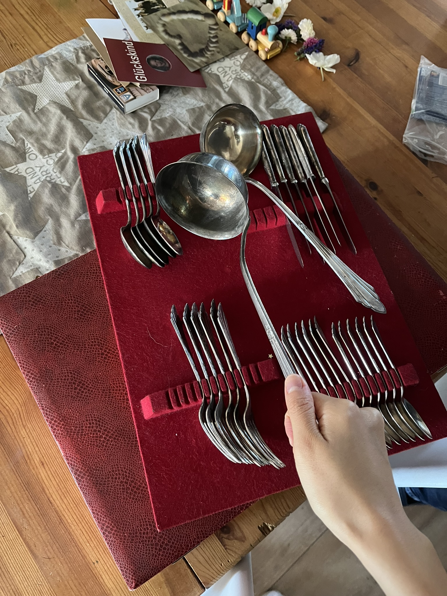 생일파티 전, 아저씨는 마치 집안의 가보와도 같은 식기를 꺼내놓으셨는데 대략 1800년대쯤부터 사용해왔던것이라고 하신다. 아저씨의 엄마의 할머니였나.. 할머니의 할머니였나.. 조금 헷갈렸는데, 어쨌든 이 정도면 개인 가정집에선 정말 오래된 물건이라 생각하니 왠지 행동이 조심스러워지는 순간이었다. 동시에 뭔가 벅차오르는 기분을 표현하고싶어, 고심끝에 생각해낸게 "나는 지금 한 집안의 역사를 보고있네!". ㅋㅋㅋㅋㅋㅋㅋㅋㅋ가끔 내가 신나서 그 순간의 기분이나 사물의 모습을 표현할때면 아저씨는 고개를 갸우뚱하며 "그건 시적인 표현이야"하며 웃으시곤 한다. 독일어로 내가 좀 낯간지럽게 말하는 느낌인걸까 싶었으나, 떠오르는 표현이 딱 그런걸 어떡해 뭐~~~! 그치만 이번엔 아저씨도 공감하셨는지 "맞아~!!"하며 수긍하셨다. 갯수도 넉넉한 숟가락, 포크, 나이프 및 기타 식기 세트들은 부활절이나 크리스마스같이 이 곳의 명절날에 쓰인다고 한다.